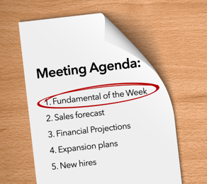 Here\’s a simple tip for making sure you remember to start the meeting with the Fundamental of the Week: Every meeting should have a written agenda. Simply create an agenda template that everyone uses for all meetings. The first item on the template is the Fundamental of the Week. Easy!